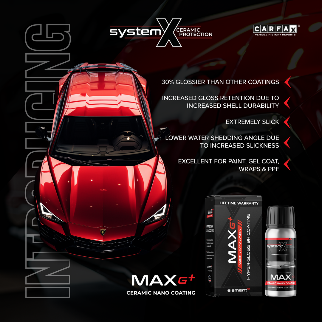 SYSTEM X G+™ bonds at the molecular level to seal and protect surfaces from environmental contaminants, harmful UV rays, and insect acids. SYSTEM X also provides resistance to light scratches and fading. Its hydrophobic properties repel dirt and liquids, making surfaces easier to clean.System X ceramic coatings register to your customer's carfax report for maximum resale value.